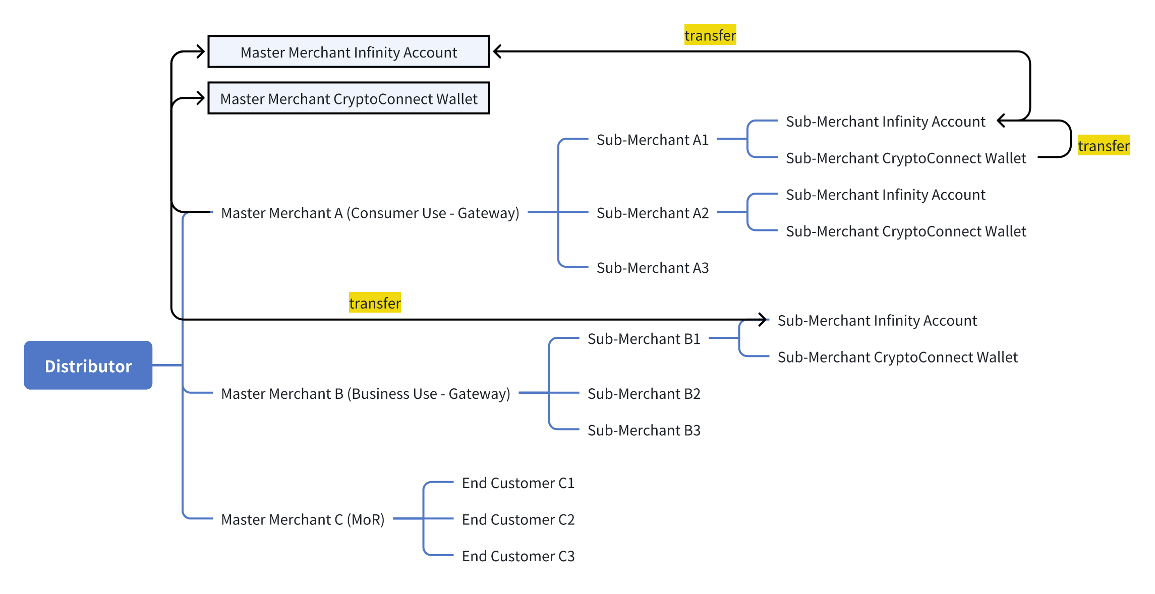 - Sub-merchants (e.g. Sub-Merchant A1) can transfer funds from their CryptoConnect Wallet to their own Infinity Account using the "Intra-account business transfer" API. The system will convert the crypto to USD before the funds are credited.