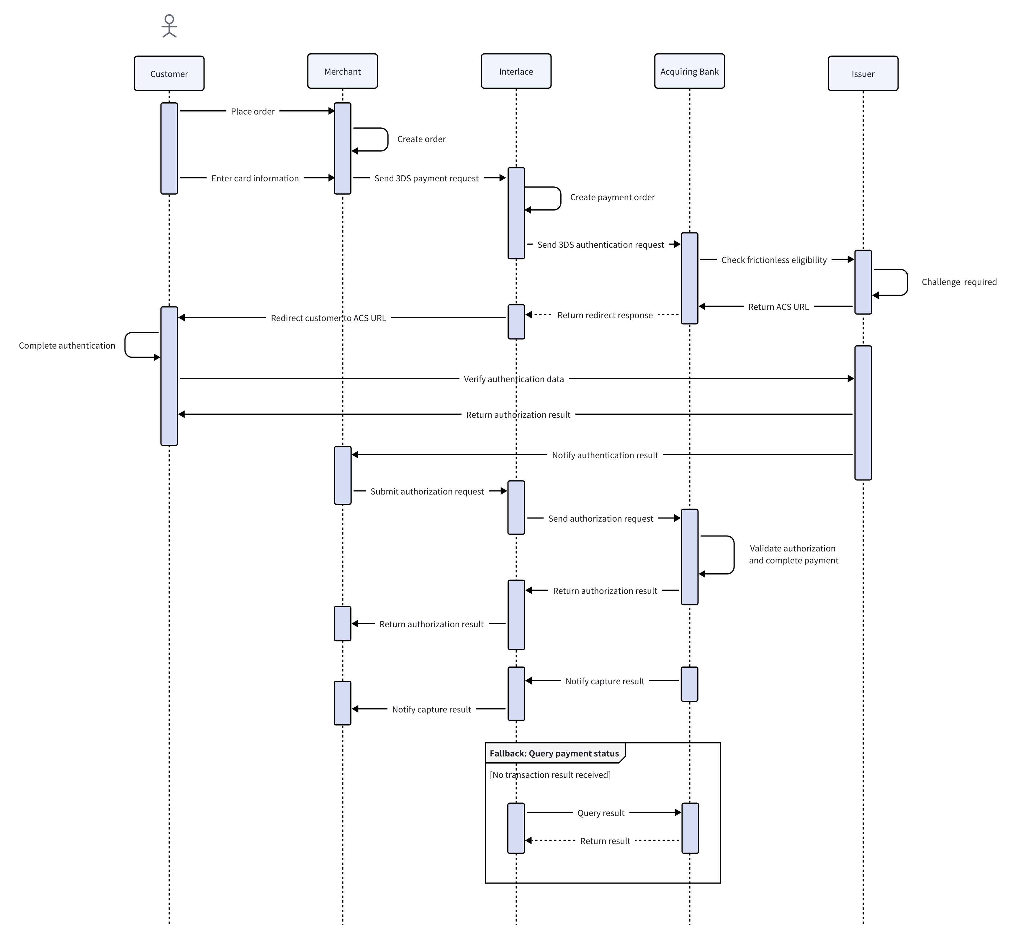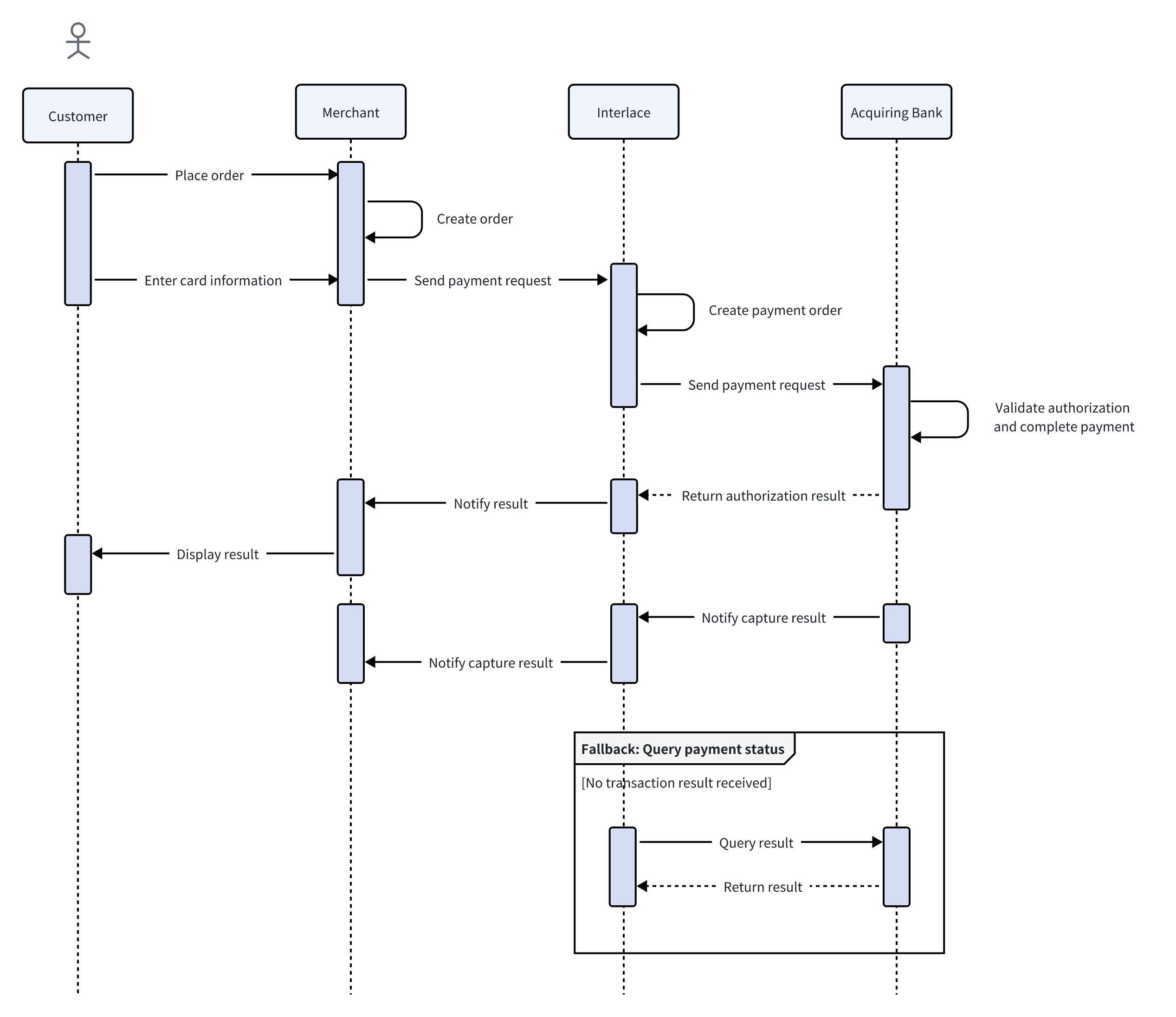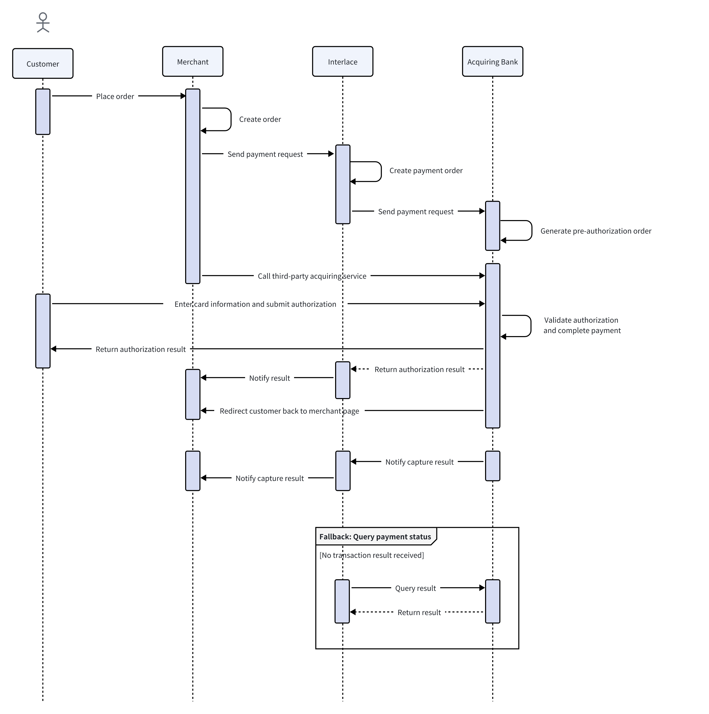 This method redirects customers to an Interlace-hosted payment page to complete the transaction. Interlace handles the collection and processing of sensitive payment data, reducing the merchant's PCI compliance requirements. For request and response examples, see the Acquiring API Resources section.