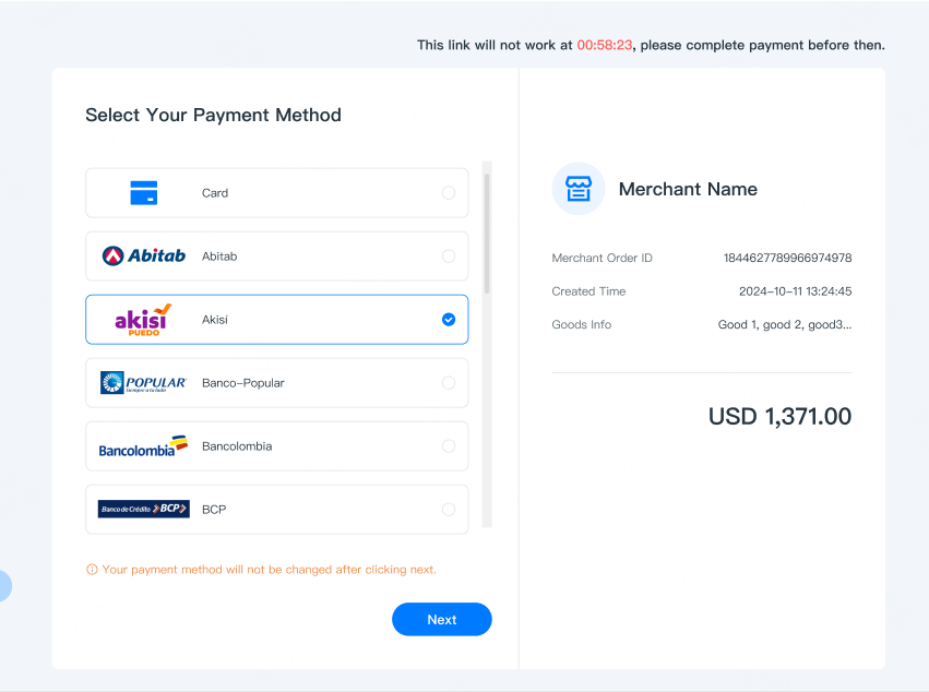 After a successful request, the response returns a unique payment link (redirectToPay). Redirect the customer to this link to complete the payment.